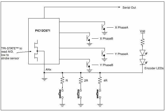 PIC12CXXX将是伟大的鼠标控制器,但它的I/O口不足。你需要两个I/O用于X轴编码器,两个用于Y轴编码器,一个用于串行输出,以及2或3个I/O用于鼠标按键,但我们仅有6个I/O口。