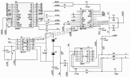 Din(19脚)、CLK(18脚)、ENB(17脚),此三个引脚为外部数据送入端。Din为串行数据输入端,在时钟由低到高转换后,比特数据流开始装载进入芯片的寄存器。其传送格式是这样规定的,即1个字节送C寄存器,2个字节送R寄存器,3个字节送 A寄存器,送数时高位在前,低位在后;ENB为低电平使能端,该引脚接高电平的时候,数据不能被读入,只有当该引脚由高转为低时才能读入数据;CLK为时钟输入脚,当时钟从低电平转为高电平的时候,数据从Din脚输入寄存器,而从高电平转为低电平的时候,数据从寄存器读出,送入内部计数器。当CLK为8个时钟周期时,访问C寄存器;CLK为16个时钟周期时,访问R寄存器;CLK为24个时钟周期时,访问A 寄存器。