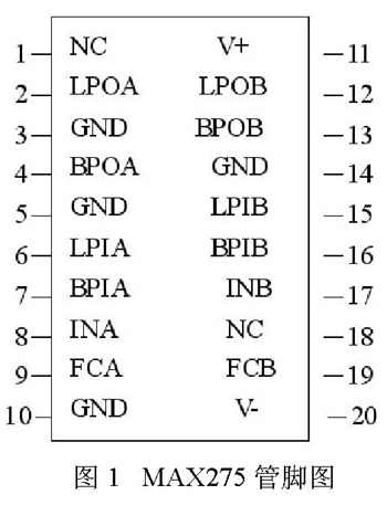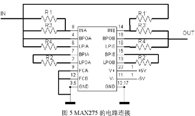 MAX275集成度高,参数调整方便。给工程项目人员带来了极大得方便。通过外接的不同器件组合,MAX275可构成多种滤波器,如中心频率可调的带通滤波器。